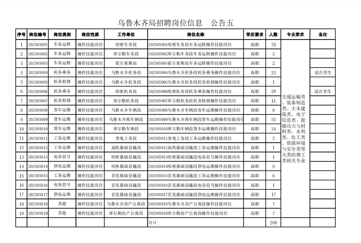 中国铁路乌鲁木齐局集团有限公司根据企业发展需要,拟招聘全日制普通高等院校专科(高职)学历毕业生,现将有关事项公告如下: