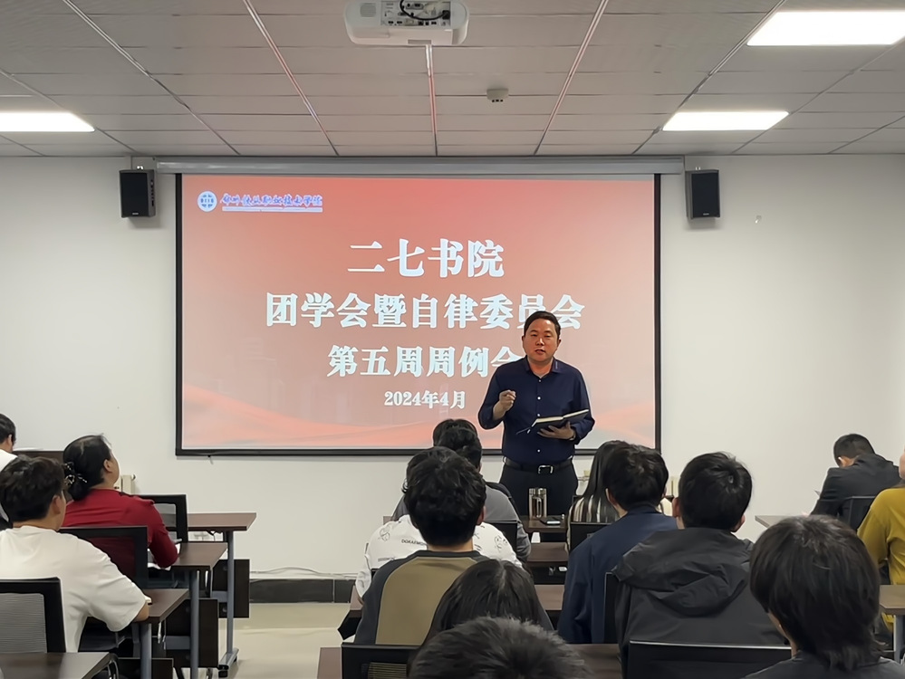 4月1日下午,二七书院召开团学会暨自律委员会第五周周例会,书院党总支书记、院长张家祥出席会议,全体育人导师、全体学生干部参加会议。