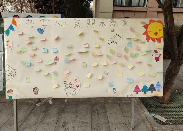 本次活动在宿舍楼下布置了精美的海报,设置了可供书写的画板,并邀请过路的同学留下自己的期末心语,鼓励同学们用文字的形式,倾诉自己的悲欢情绪。