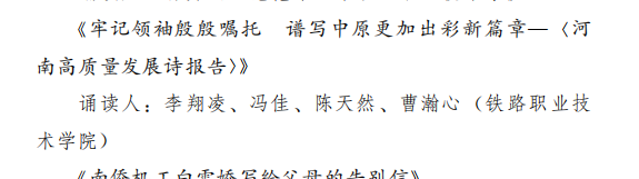 日前,河南省教科文卫体工会下发了《关于“悦读新思想 喜迎二十大”经典诵读活动获奖作品的通报》(豫教科文卫体工〔2022〕17号),我校教师李翔凌、冯佳、陈天然,曹瀚心老师的作品《牢记领袖殷殷嘱托 谱写中原更加出彩新篇章— <河南高质量发展诗报告>》获得一等奖,席振超老师的作品《红船,从南湖起航》获得二等奖,叶艳芳老师的作品《中国梦的本质是国家富强、民族振兴、人民幸福》 、李涵潇、胡宪丽老师的作品《喜迎二十大,永远跟党走》获得三等奖。