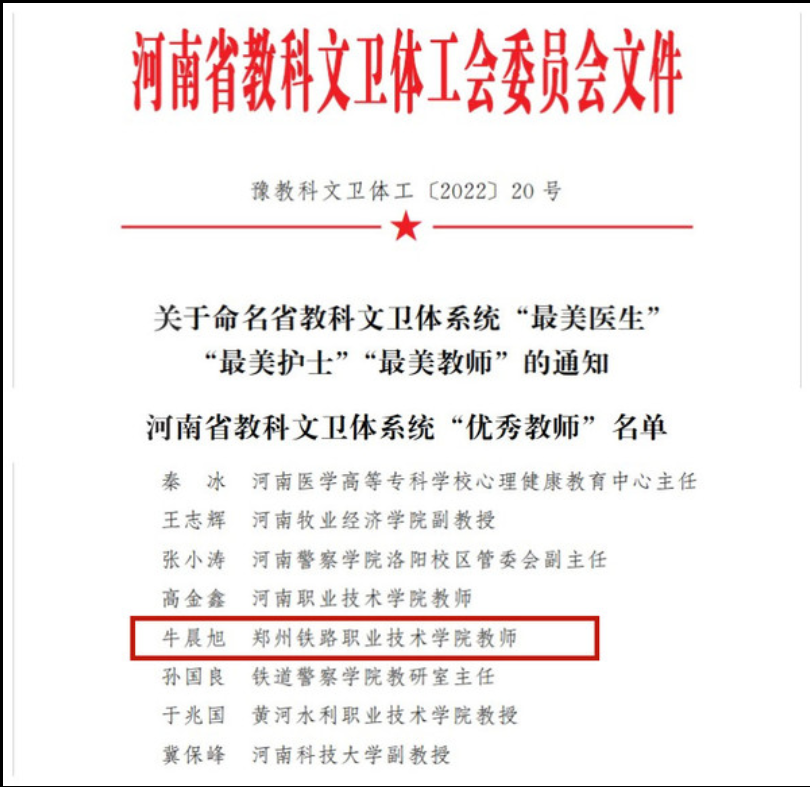 根据河南省教科文卫体工会《关于命名省教科文卫体系统“最美医生”“最美护士”“最美教师”的通知》,我校机车车辆学院牛晨旭老师荣获河南省教科文卫体系统“优秀教师”荣誉称号。