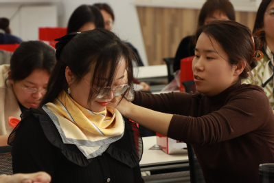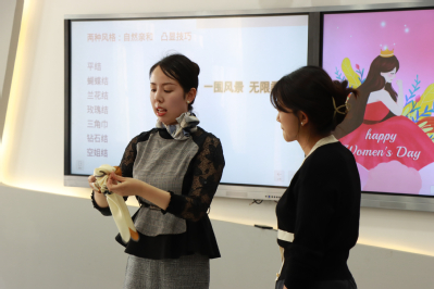 活动中,刘楚然老师为大家讲述了丝巾文化、不同种类和材质的丝巾搭配。吕娜老师为大家讲解了丝巾的不同戴法,如优雅的巴黎结、活泼的鸡冠结、率性的领带结、实用的8字结、绚丽的空姐结等。两位老师用灵巧的双手,为大家展示了丝巾的无穷魅力,大家跟着两位老师演示的步骤,认真地学习,对折、翻叠、打结、整理,笑容洋溢在每一个人的脸上。