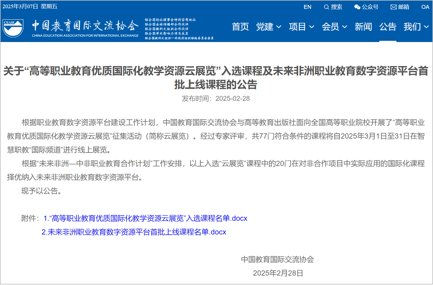 根据公示名单,此次共有13所院校开发的20门课程纳入未来非洲职业教育数字资源平台,我校入选数量位居全国首位。下一步,学校将以第二轮“双高计划”为引领,聚焦关键岗位核心技能,融合前沿数字技术,属地化、模块化开发国际职教资源,为推动“一带一路”国际产能合作和海外中资企业属地化发展提供重要人才支撑和智力支持。