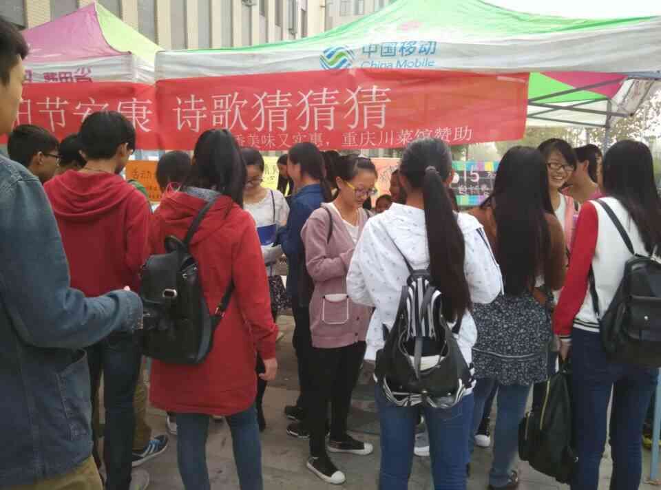 丹桂飘香,金秋送爽,为弘扬中华民族爱老敬老的传统美德,10月21日上午10:00由运输管理系青年志愿者协会主办的重阳节主题活动在新校区餐厅门口举行。   活动围绕重阳节这一主题展开,首先通过横幅的形式展示了此次活动的中心内容,青协成员讲述重阳节的由来及风俗习惯,接着,重阳节猜字谜赢奖品趣味活动热闹进行,别致的形式吸引了许多同学参与,现场气氛热烈。最后,青年志愿者协会成员公布字谜答案并给获奖同学颁发了奖品,活动圆满结束。 重阳节主题活动不仅使中华民族的美好品德得以发扬光大,深入人心,更丰富了同学们的校园生活,促进大学生综合素质的发展。