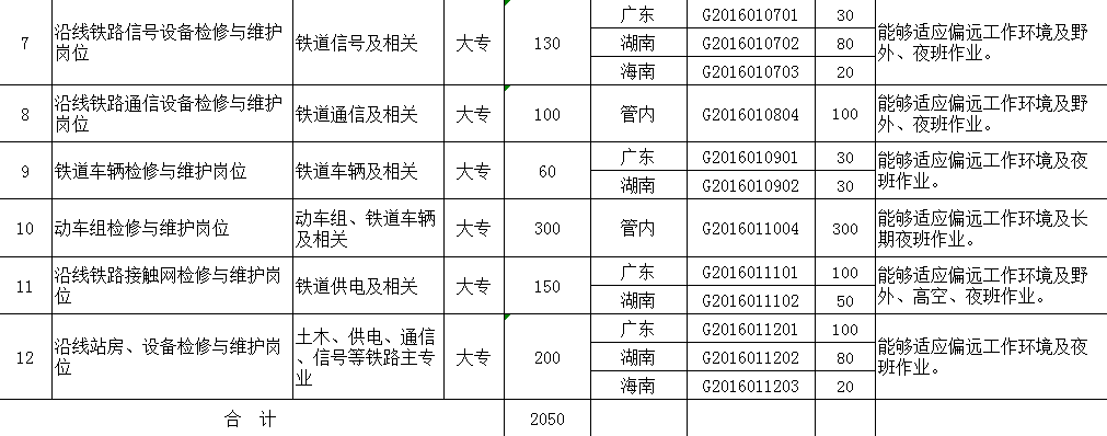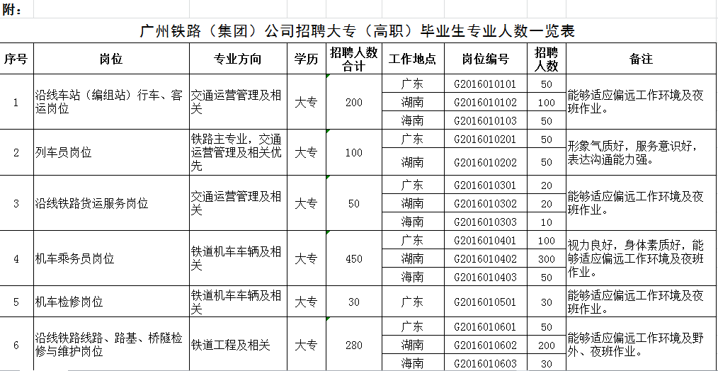 广州铁路(集团)公司招聘2016届铁路主专业大专(高职)毕业生公告(四) 广州铁路(集团)公司根据企业经营发展需要,拟招聘2016年铁路主专业应届全日制普通高校大专(高职)毕业生,现将有关事项公告如下: 一、招聘计划 招聘专业、岗位、人数和工作地点具体见附表。 二、报名应聘条件 1. 列入国家招生计划的2016年应届且具备派遣资格的全日制普通高等院校大专(高职)毕业生; 2. 遵纪守法,品行端正,热爱铁路事业; 3.学习成绩优良,专业、学历等符合招聘岗位要求,在校期间所学专业方向为铁路专业方向,所学主要课程中包含铁路专业课程; 4.身心健康,无色盲色弱,身体条件符合招聘岗位要求; 5. 能够服从岗位安排和调整,适应偏远工作环境、夜班作业和招聘岗位的其他工作要求。 新录用毕业生全部安排在生产一线岗位工作,按操作技能人员培养使用。 三、招聘流程 招聘流程按以下环节进行:发布招聘公告、网上报名、资格审查、面试考核、公示、签约等。 1. 网上报名。报名采取网上报名方式,报名时间为11月4日-11月20日。有意应聘的2016届高校毕业生在规定的时间内登录广铁集团门户网站(http://www.gzrailway.com.cn)并点击网页右上角“应届高校毕业生招聘”进入广铁集团高校毕业生招聘系统,进行网上报名,职位申请时选择“广州铁路(集团)公司招聘2016届铁路主专业大专(高职)毕业生公告(四)”所对应的岗位。应聘毕业生本人通过网上报名系统如实填写所有报名相关信息,系统将自动生成《广铁集团招聘应届高校毕业生个人信息登记表》,请下载打印。如发现弄虚作假,取消应聘资格。 2. 资格审查及面试。用人单位将根据岗位需要分期分批审核筛选毕业生参加现场资格审查及面试。未进入该环节的毕业生恕不通知,未按时参加者视为自动放弃。面试考核截止时间为11月30日。 参加资格审查和面试的毕业生应携带以下资料: (1)网上报名下载并经本人签字确认的《广铁集团招聘应届校毕业生个人信息登记表》; (2)身份证、应届毕业生就业推荐表、成绩单原件(包含在校期间全部成绩,须学校盖章)及各种证书材料等; (3)全国普通高等学校毕业生就业协议书; (4)体检报告。三个月内的二级甲等及以上医院常规项目体检表(按国家公务员体检项目),其中血压、辨色力、视力、听力、心电图、胸片、血常规、尿常规、肝功能、肾功能、空腹血糖为必检项目。 3. 公示及录用。拟录用人员在中国铁路人才招聘网公示。公示期满无异议的,办理签约录用手续。 四、其它事项 1. 本批次招聘一律通过网上报名的方式进行,不接受现场、上门、电话、传真、邮件等其他方式报名。 2. 应聘者须在招聘期间保持本人手机畅通,以免招聘相关信息无法通知。凡因求职者通信不畅造成的后果,本公司不承担任何责任。招聘过程中,凡未进入下一环节者,恕不通知。 3. 广州铁路(集团)公司不委托第三方招聘,不向应聘毕业生收取任何费用,不指定辅导用书,不举办也不委托任何机构或个人举办任何形式的辅导培训班,请应聘毕业生提高警惕,谨防受骗。 4. 广州铁路(集团)公司人事处保留对招聘公告及附件中各项要求的最终解释权。咨询电话:020-61323331,联系人:陈老师。 广州铁路(集团)公司人事处 2015年11月4日