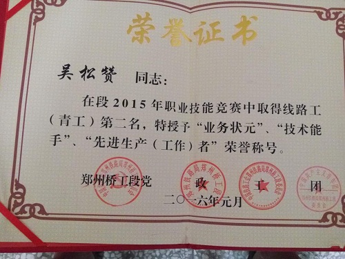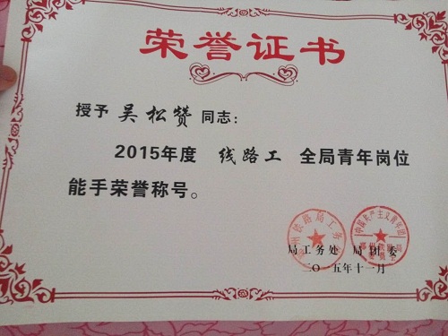 在校期间曾获院“三好学生”、“优秀毕业生”等称号。就职以来,先后荣获单位2012年度、2013年度“青年突击手”称号,荣获2015年度“业务状元”、“技术能手”、“先进工作者”称号,在郑州铁路局2015年青工比武中获得第二名,被评为全局线路工“青年岗位技术能手”。