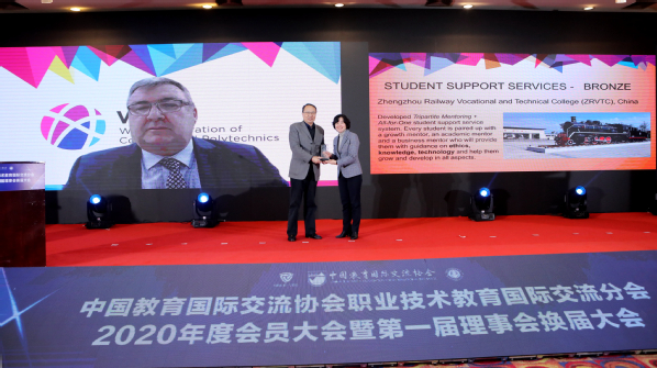 11月27日,2020年度世界职教院校与技术大学联盟(WFCP)卓越奖颁奖典礼中国分会场在南京举行。会上,宣布了2020年度卓越奖获奖名单,我校荣获世界职教院校联盟卓越奖“学生支持服务”奖项铜奖。此次获奖在我省职业教育行业尚属首次,填补了该领域的空白,为进一步推动河南职业教育高质量发展奠定了坚实基础。我校副校长董黎生出席颁奖典礼并代表学校领取奖项。世界职教院校与技术大学联盟(WFCP)副主席——中国教育国际交流协会副秘书长沈雪松女士为我校颁奖。