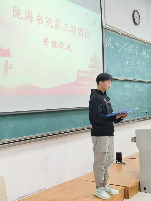 10月26日下午,陇海书院在7125教室举行第三期团校开班仪式。书院团总支书记佟咚,副书记毛靖涛及我院全体入团积极分子参加了仪式。仪式由团学会组织部副部长章珑献主持。