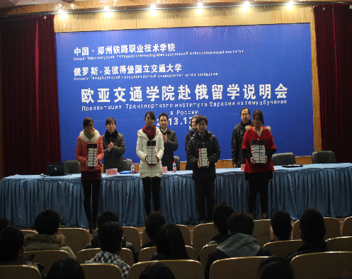 12月19日,欧亚交通学院2013年赴俄留学说明会在幸福校区第一学术报告厅隆重举行。 欧亚协会会长冯耀武,俄罗斯圣彼得堡交通大学驻中国代表维多利亚,欧亚交通学院的领导和俄罗斯圣彼得堡大学驻郑办事处人员出席此次活动。 欧亚交通学院2012级、2013级学生和部分学生家长参加会议。