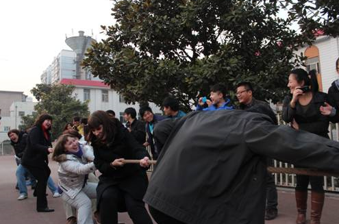 首先进行的是保龄球比赛,由外籍教师率先开球,接下来中外教师轮番上阵各显身手,最终来自新加坡的Elson老师三投11中,带领外方队员赢得了此环节的胜利。在随后的跳绳比赛中,中方教师显然是有备而来,轻松赢得了胜利。最精彩的是拔河比赛,由于双方势均力敌一时难分胜负。在僵持了近一分钟后,情况出现了转折,中方队员一鼓作气成功问鼎。