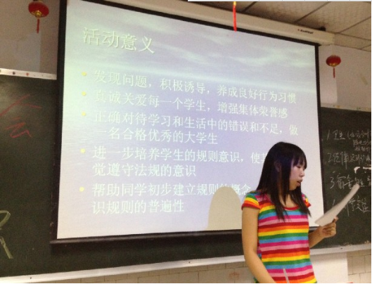 各班根据自身情况,将本班学生集中存在的违规行为、不良习惯、错误认知一一进行了分组讨论和分析发言。大家针对上课迟到旷课、班级宿舍卫生差、校规淡忘等具体问题进行了班内对策制定,明确了在校生活学习中“应该”干什么,并再次强调和细化了以小组监督、班委引导、班长上报、辅导员批评教育四步骤循环的班风建设制度,旨在提高学生道德、纪律、人际交往等方面的规则意识。