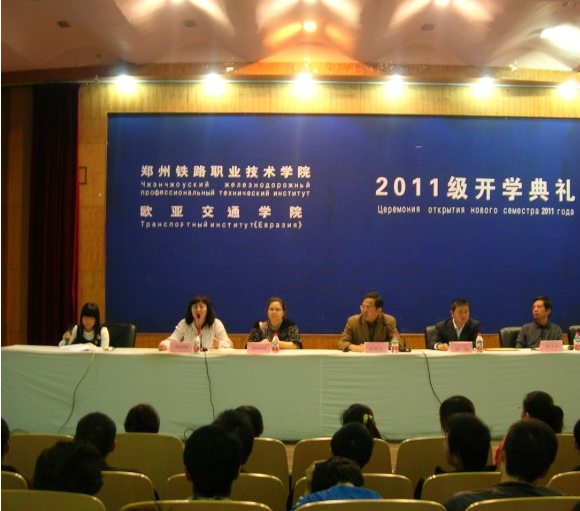 欧亚交通学院副院长张中央在典礼上就本院与俄罗斯圣彼得堡国立交通大学联合办学的情况做了详细介绍,结合我国目前铁路建设的大好局面分析了未来良好的就业形势;俄罗斯外教代表拉莉莎致辞勉励新生勤奋学习并热烈欢迎新老同学到俄罗斯圣彼得堡国立交通大学深造。欧亚学院2010级工程机械控制专业学生祝兴同学现场翻译了拉莉莎老师的讲话;欧亚学院2010级机车车辆专业学生苏咏春同学代表老同学发言欢迎新同学的到来,并用俄语把热情洋溢的俄罗斯诗歌送给在场师生,展示了一年来同学们俄语学习的成绩;陈奕仁谈同学代表2011级新生发言,表示一定要发奋努力,刻苦学习,做一名骄傲的铁院人。