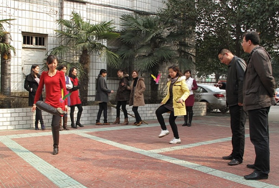 “好久没踢毽子,快让我试试!”大家兴致勃勃地进行着踢毽子比赛,男同志们也积极参与,在场外热情加油。教职工们欢声笑语,在繁忙的工作之余体会着节日的快乐。