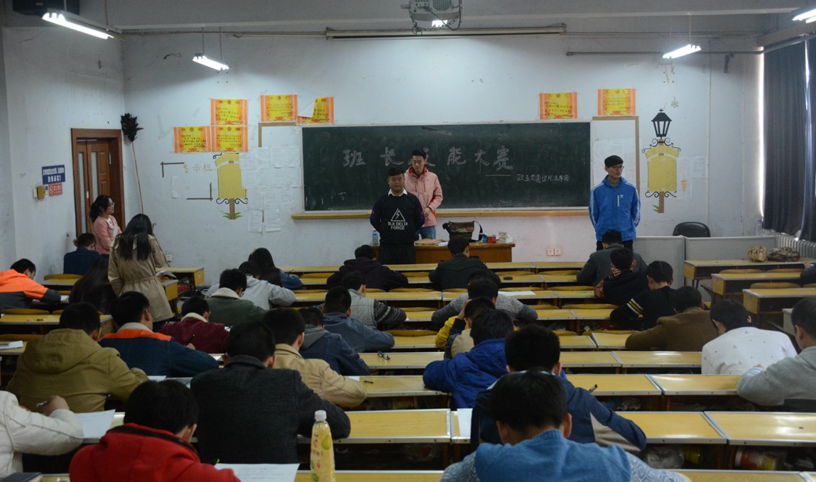 本次班长技能大赛的比赛流程,共分两个环节,第一环节为笔试答题,考察同学们对于学生手册内容和班级学生的了解程度。第二环节为面试题,台下评委们通过对奖学金评定、导员查寝、考试作弊、感情裂痕、寝室矛盾等一系列日常生活中容易出现的问题考察班长和团支书对班级日常管理能力和对突发事件的应变能力。最终经过激烈的角逐,王一杰、马铮、薛闯三名同学的综合成绩最高最终了获得本次比赛的一等奖。