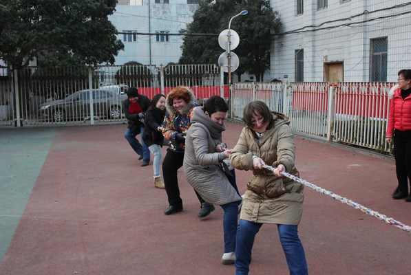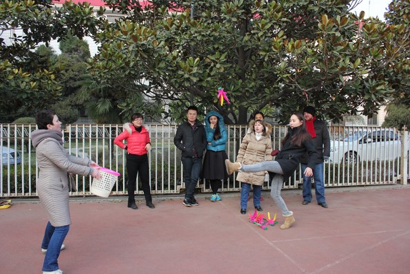本次联谊活动共设置“托球跑”、“踢毽子”、“拔河”三个项目。在乒乓球拖球跑活动中,中外教师轮番上阵,各显身手,外籍教师最终以2分10秒的成绩赢得本场比赛。在踢毽子比赛中,办公室小组以15进14的优势赢得比赛。在拔河比赛中,开始双方势均力敌,最后中方教师胜出。