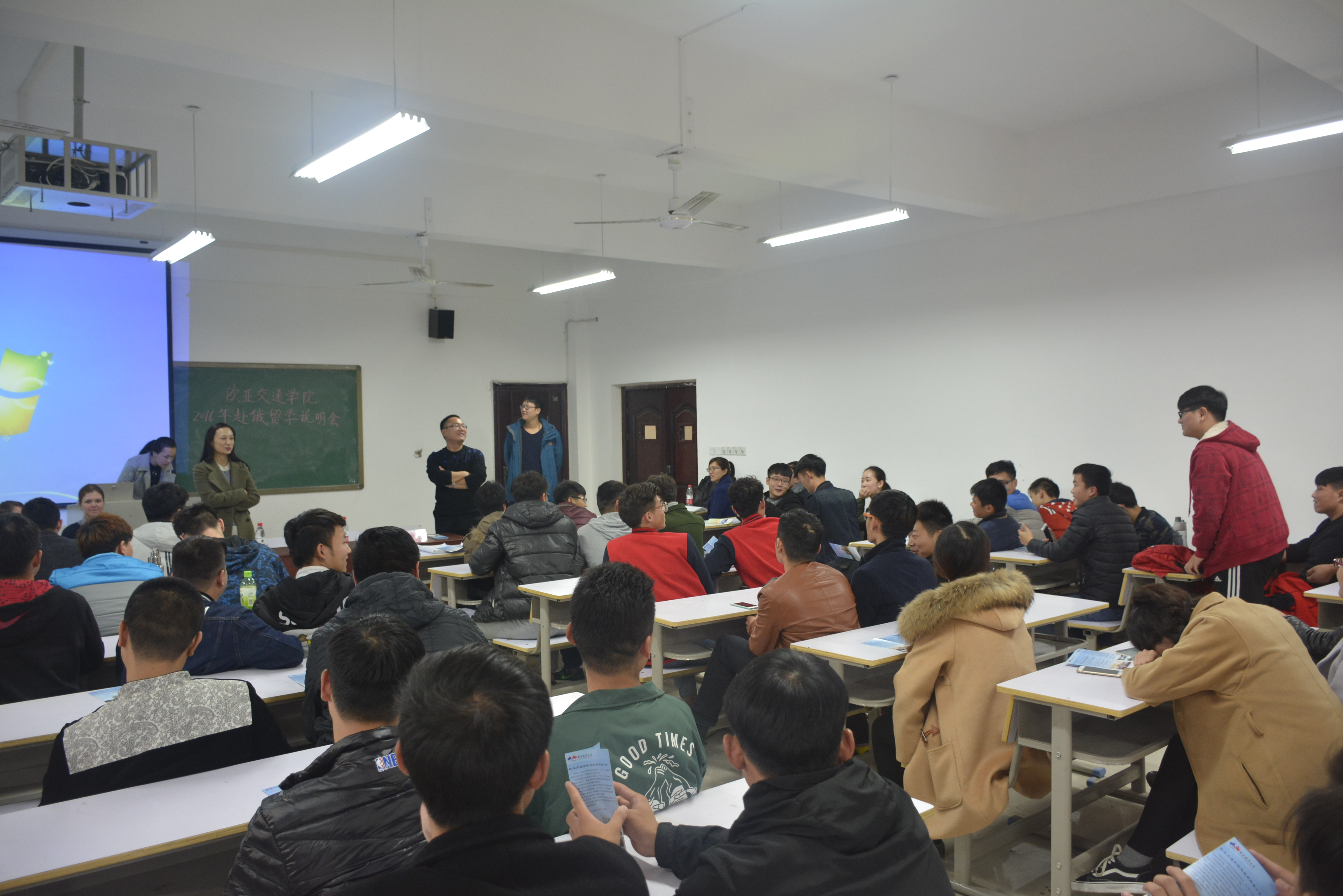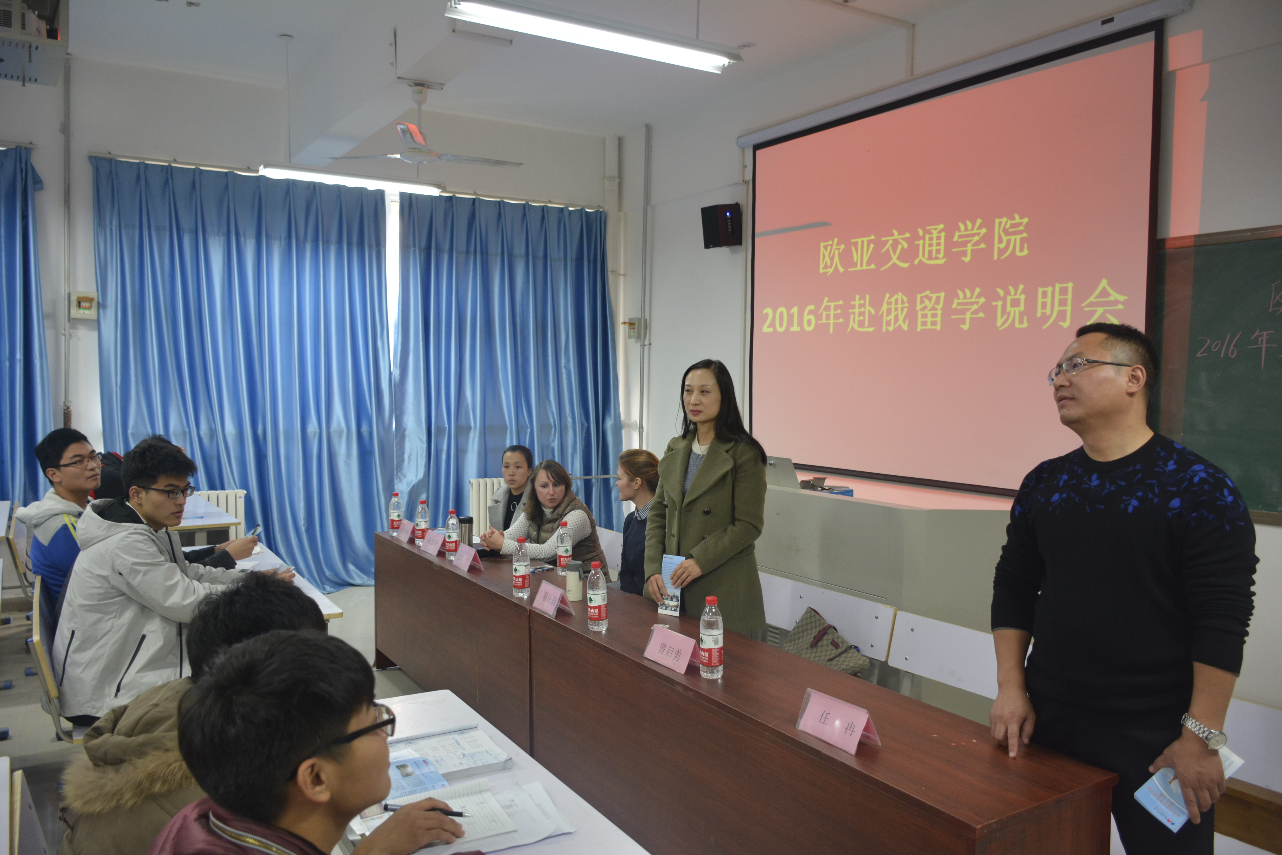 11月15,国教(欧亚)学院2016年赴俄留学生说明会在新校区七号楼212教室举行。国教(欧亚)党总支副书记曹启勇,学工办主任任冉,亚欧协会驻郑办事处主任敬乐蔚及学院中外教师出席此次活动。欧亚交通学院2015、2016级学生代表参加了本次会议。