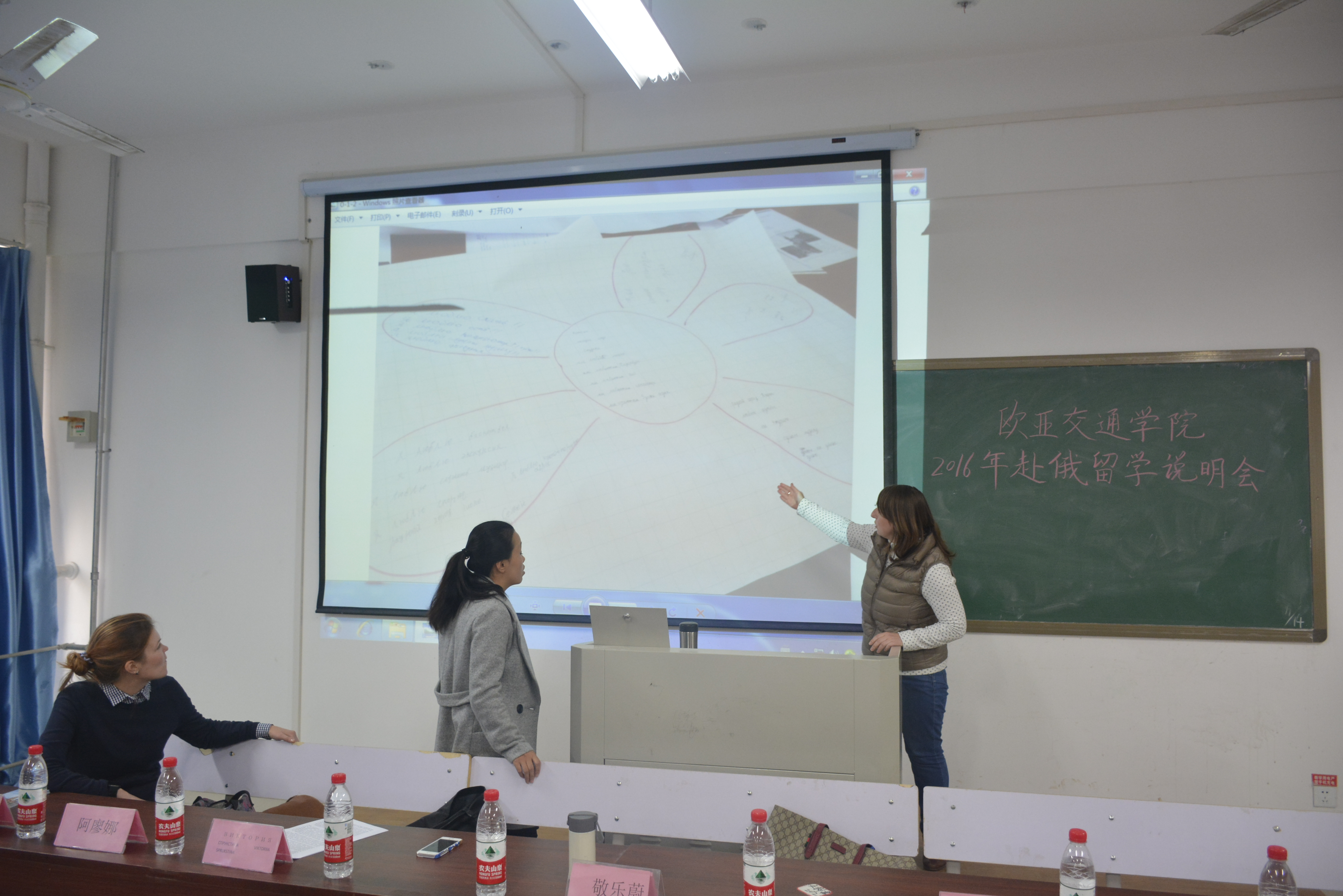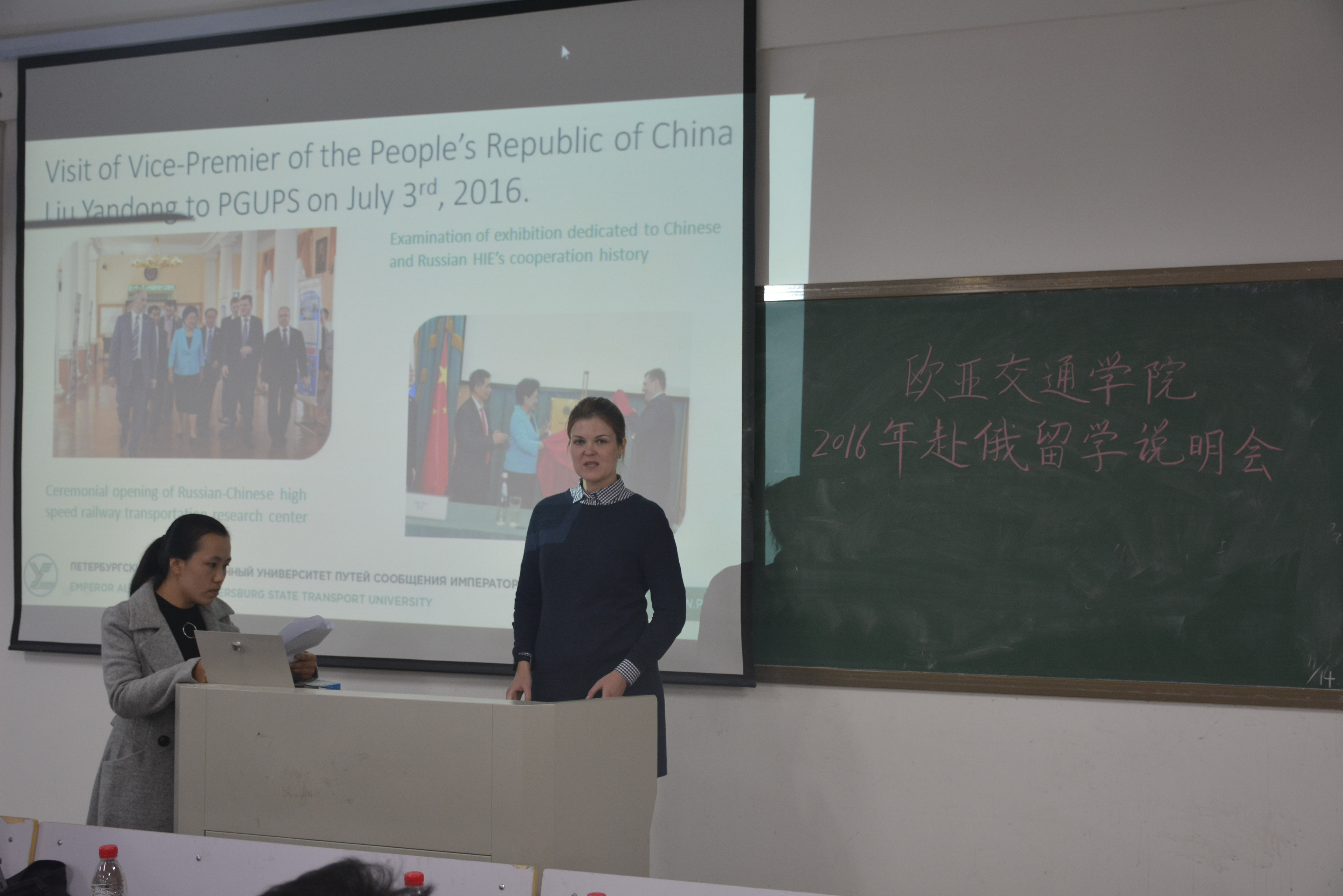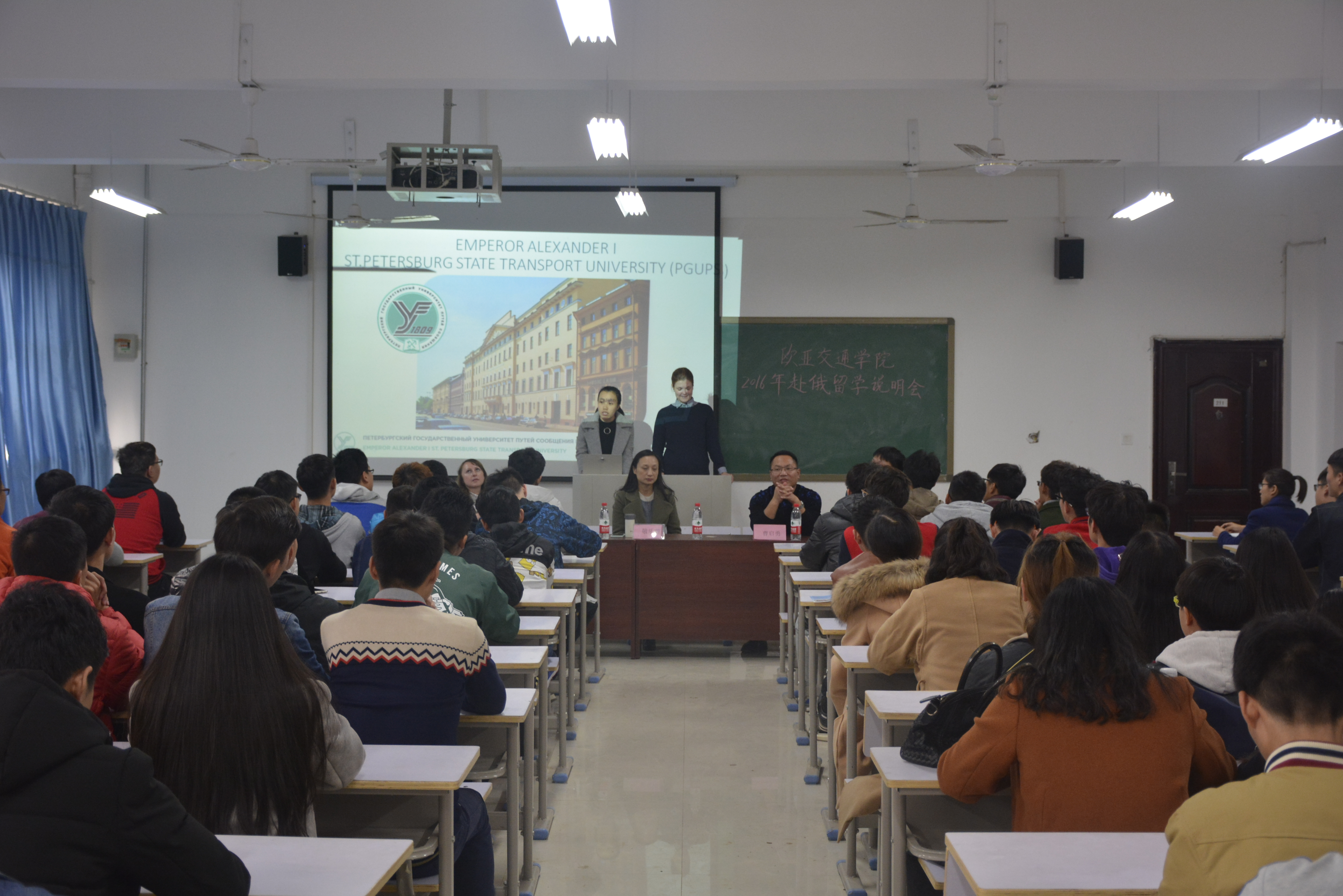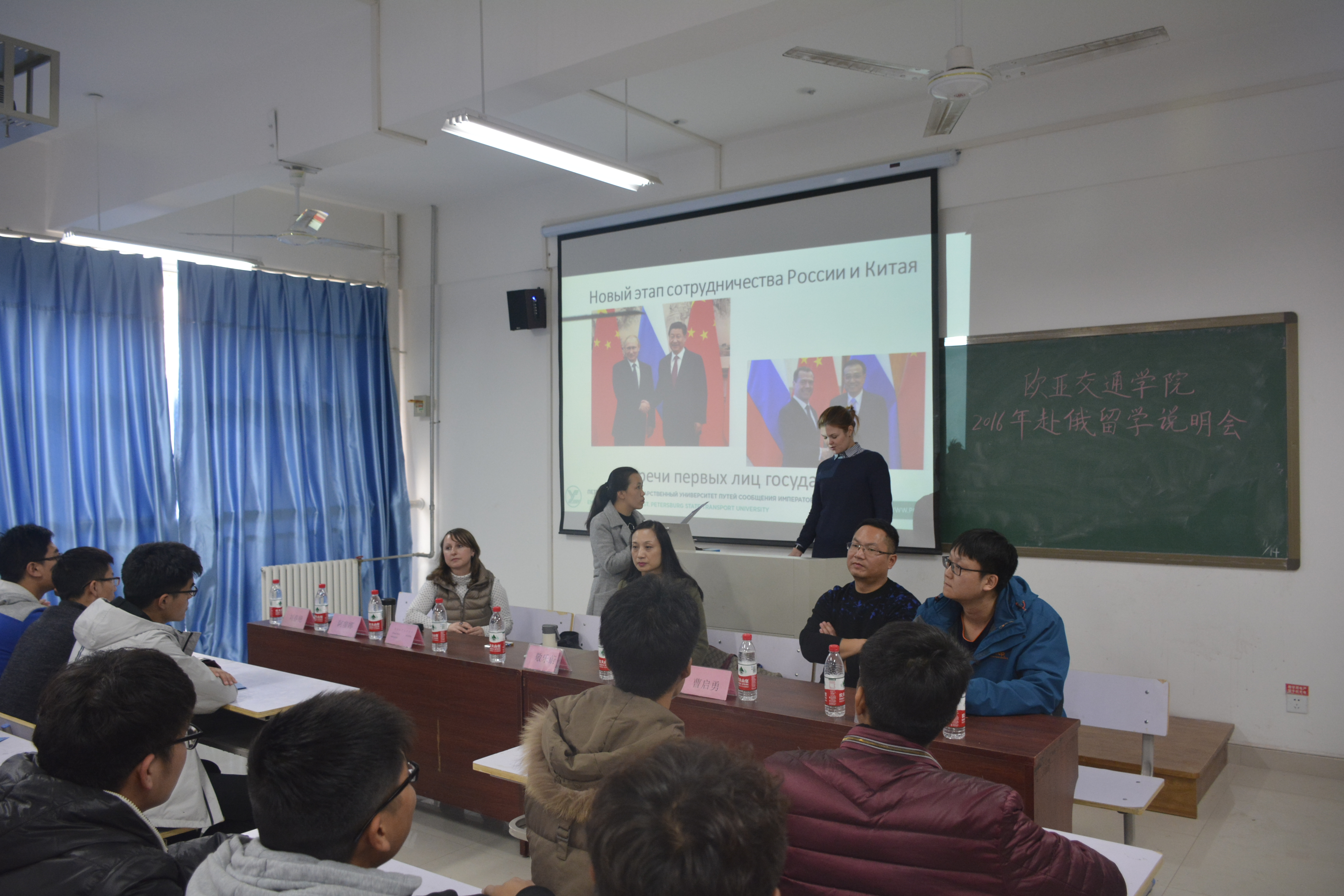 首先,圣彼得堡国立交通大学驻华代表维克多利雅对俄罗斯圣彼得堡国立交通大学的发展历程、相关专业及周边环境进行介绍,之后外籍教师阿廖娜为同学们展示关于圣彼得堡国立交通大学的PPT,并详细介绍了我校留学生在俄的生活、学习等方面,最后亚欧协会驻郑办事处敬乐蔚主任对赴俄留学流程、出国留学常见问题及欧亚交通学院赴俄留学夏令营等方面做了讲解说明。在互动环节,气氛热烈,同学们就专业方向、奖学金、学历等问题积极提问,并得到了敬乐蔚主任和曹启勇书记的耐心解答。
