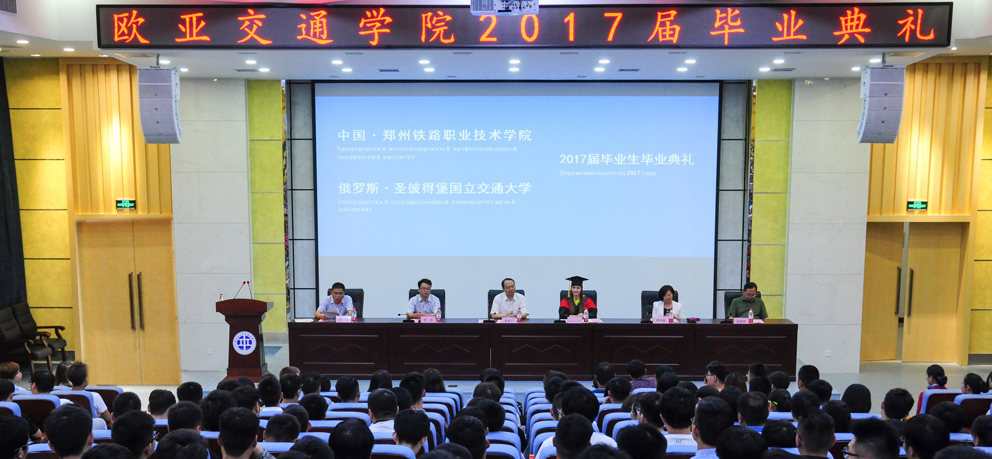 6月6日下午,我校欧亚交通学院2017届毕业典礼在新校区7号楼第二学术报告厅隆重举行。我校副校长董黎生、倪居,俄罗斯圣彼得堡国立交通大学校方代表依琳娜出席典礼。学校办公室、学生工作部、团委、科研外事处、电子工程系、欧亚交通学院、欧亚协会等单位的负责人以及中外教师和2017届毕业生参加了典礼。