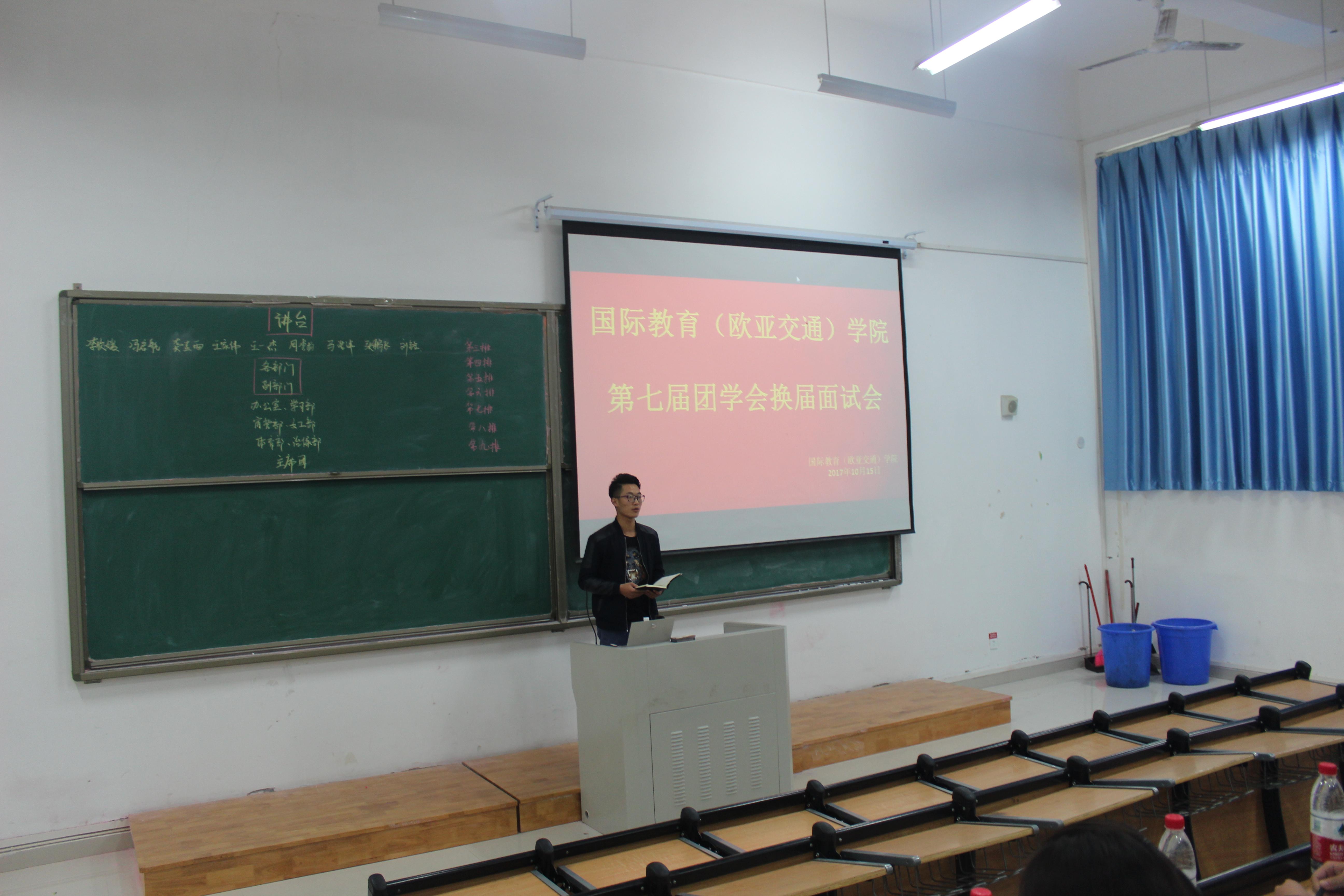 2017年10月15日下午14点30分国际教育(欧亚交通)学院第七届团学会换届面试会在7124以及7125两个教室同时进行,团学会主席团、各部门部长、副部长以及大二参加面试的部门干事参与本次面试会。