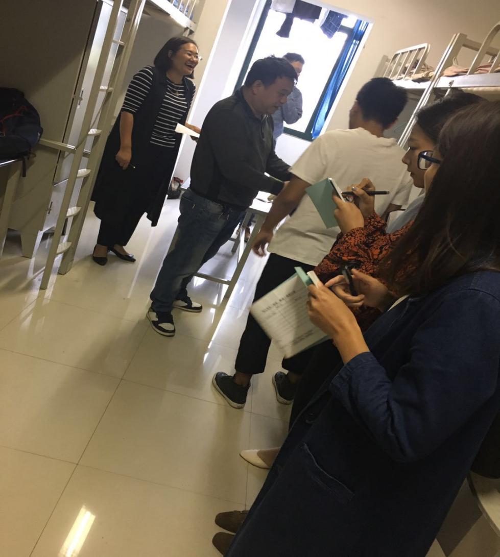 考察过程中,罗书记亲自手把手折叠毛巾,制定叠放标准,辅导员和团学会干部们认真记录学习,罗书记的这种做法引得在场众人齐“点赞”!
