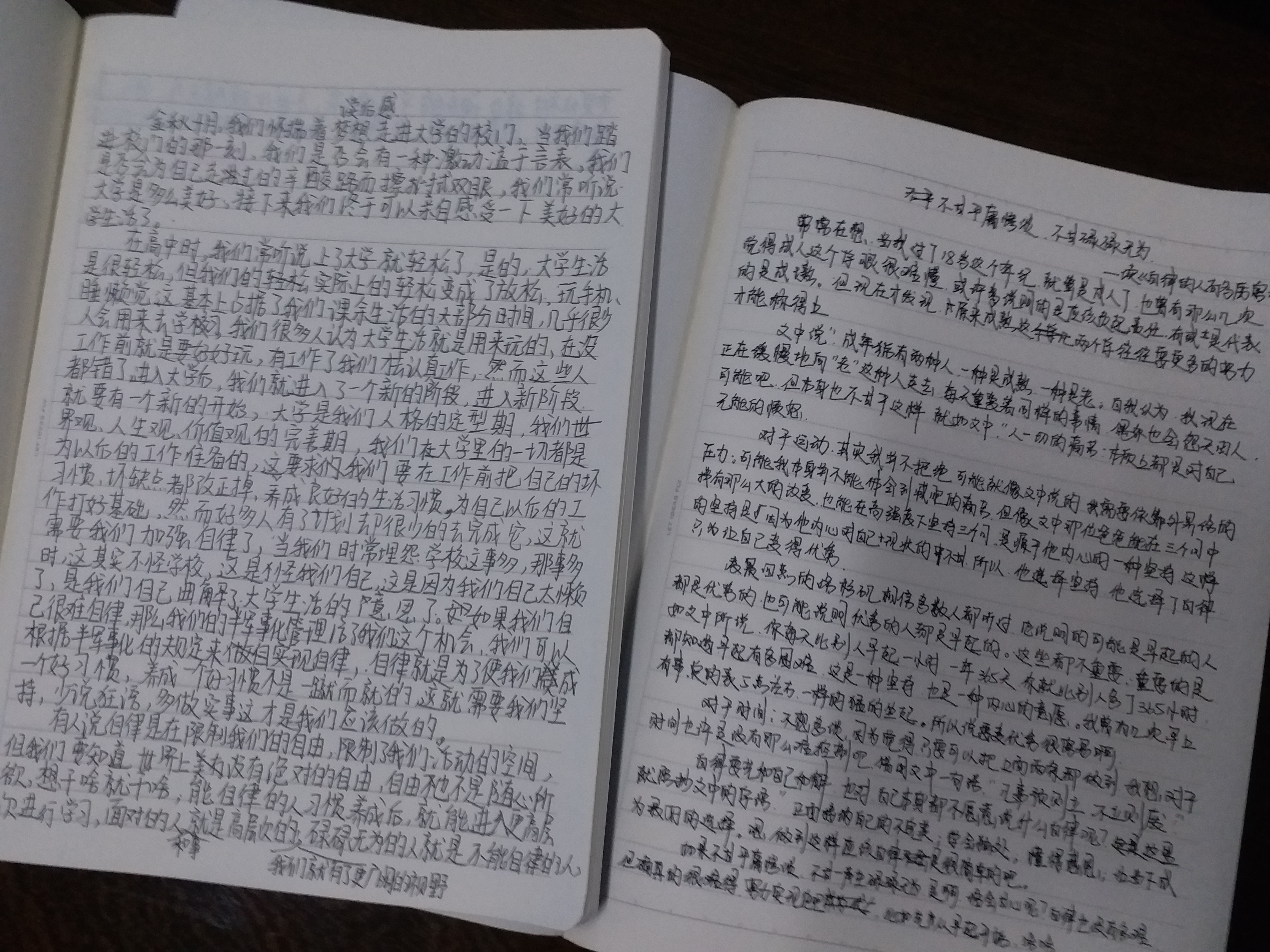 半军事化管理示范班的同学们通过认真阅读推送文章,于11月27日把读后感交给了辅导员,辅导员进行了认真审阅。文章中半军事化管理示范班的同学们都有了很大的感悟,认识到自身在自律方面还需要不断提升。