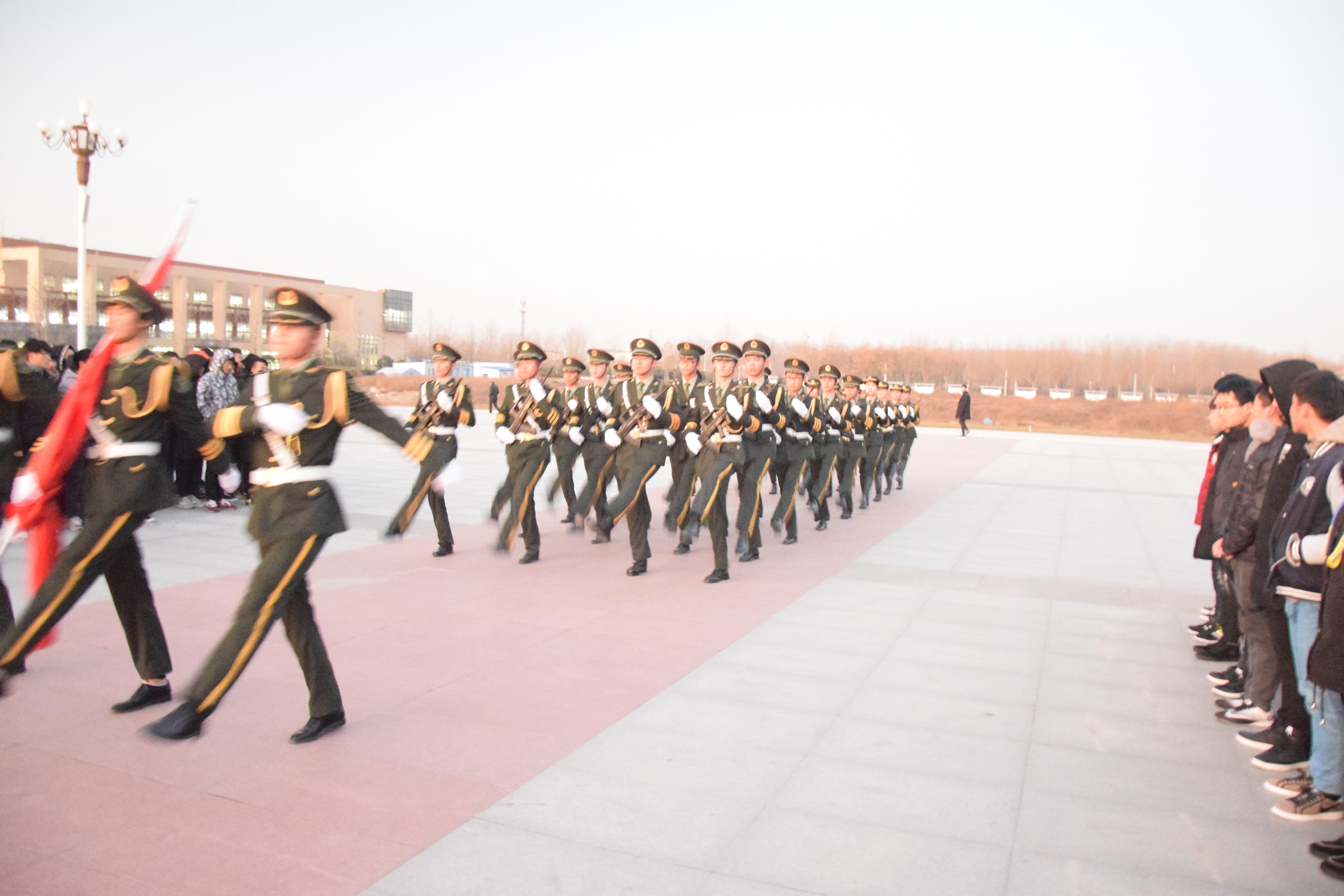 国际教育(欧亚交通)学院的学子不畏严寒,个个精神饱满,抬头挺胸,等待着国歌地响起、五星红旗地飞扬。7点整,仪仗队的旗手们着装整齐,迈着矫健的步伐,护着鲜艳的五星红旗入场举行升旗仪式。伴着《义勇军进行曲》的响起,全体唱国歌、行注目礼,庄严肃穆。