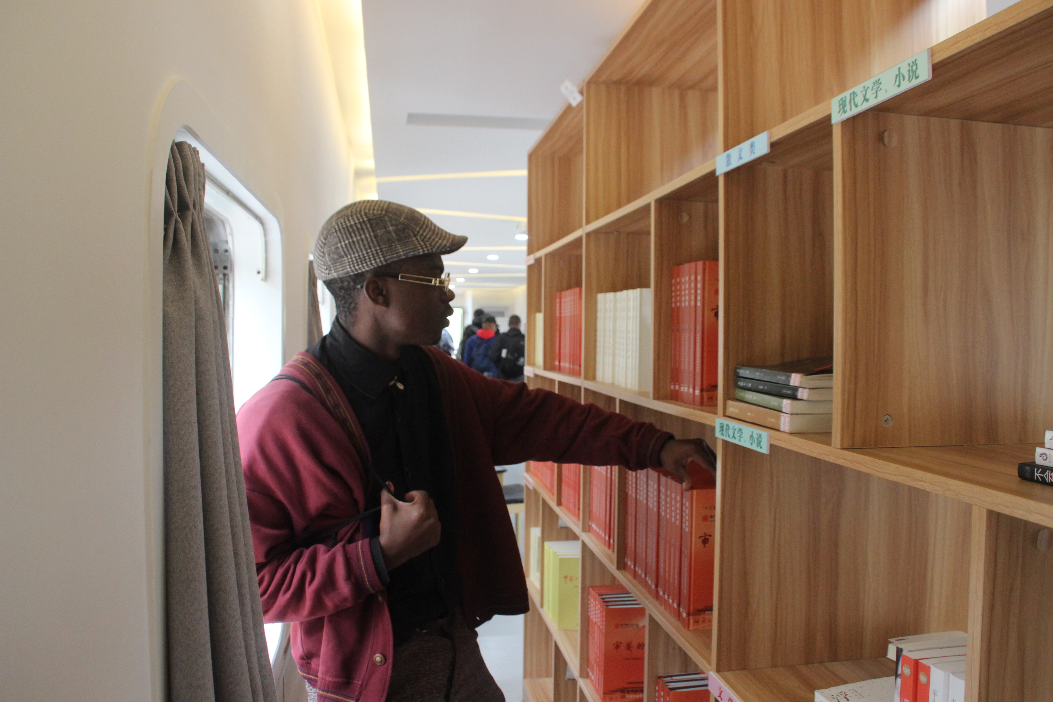 在参观过实训教室后,南非国际留学生来到了列车书吧,在负责老师的讲解下,南非国际留学生对列车书吧新颖的环境设计以及优雅的阅读环境赞叹不已,感叹新校区的优美环境为他们的语言、专业学习都提供了极大的方便。