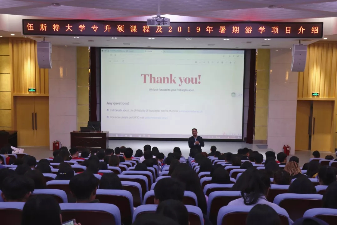 首先向学生们介绍了伍斯特大学,伍斯特大学是历史悠久公立大学,对学生提供国际化课程,使学生打开视野。学校开设专升硕课程。大专毕业生也可以读研究生。英国政府对伍斯特大学提供投资,学校的规模很大。
