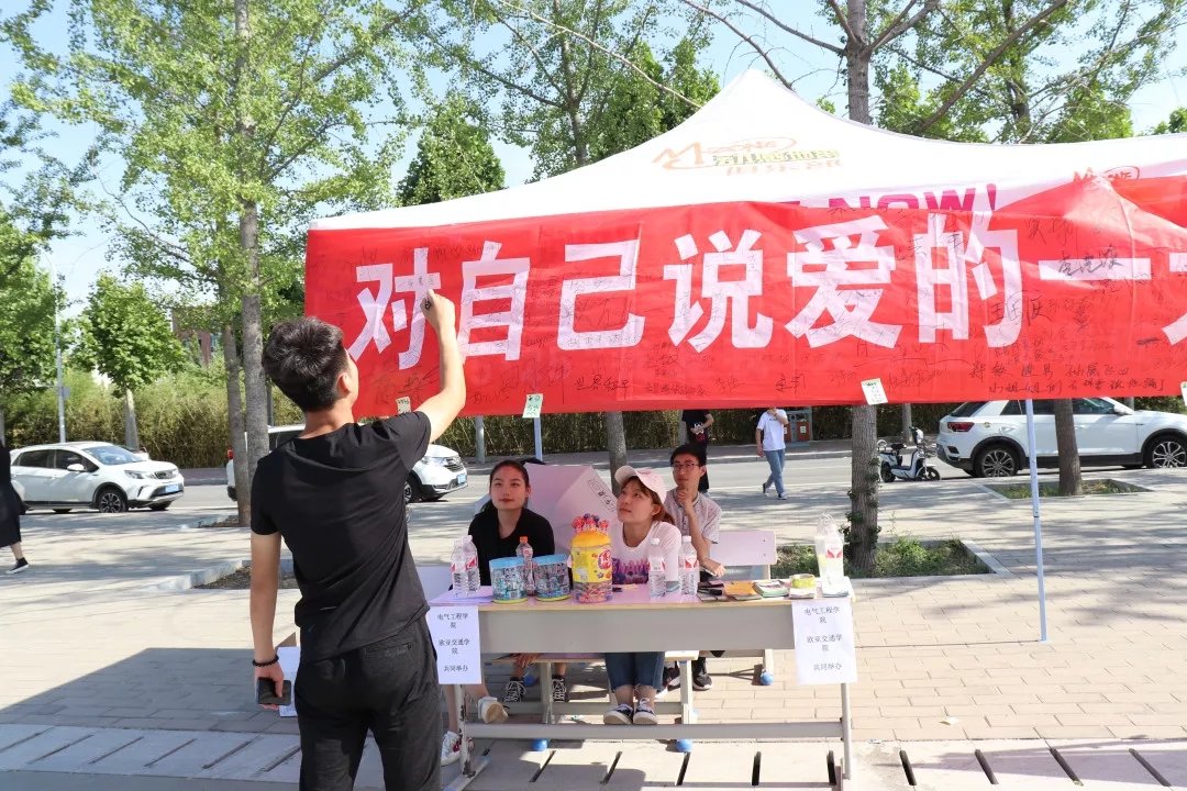 首先,到场的学生在广场的横幅上进行现场签名活动并写出自己的梦想。每名学生都认真思考,随后写下愿望,这样更加有助于学生们督促自己完成人生目标,端正人生态度。紧接着拉起横幅,心健部干事借助宣传板上的内容,对到场学生讲解关于525的来由、意义和重要性,使学生了解到珍爱自己就是真爱他人,感受到生命的活力和生命的宁静。