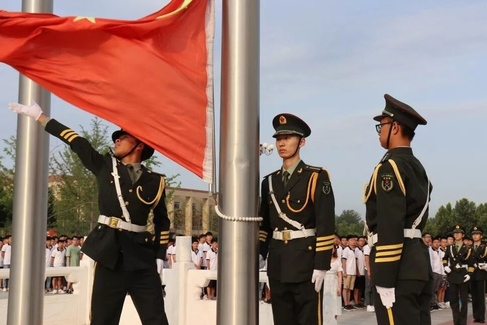 仪仗队成员迎着朝阳迈着铿锵的步伐将国旗护送到国旗台下,全场肃静。在激昂的《义勇军进行曲》中,升旗手振臂一挥,鲜艳的五星红旗徐徐展开,在学生的注目中,迎着初升的太阳,在晨曦中迎风飘扬在铁院的上空。