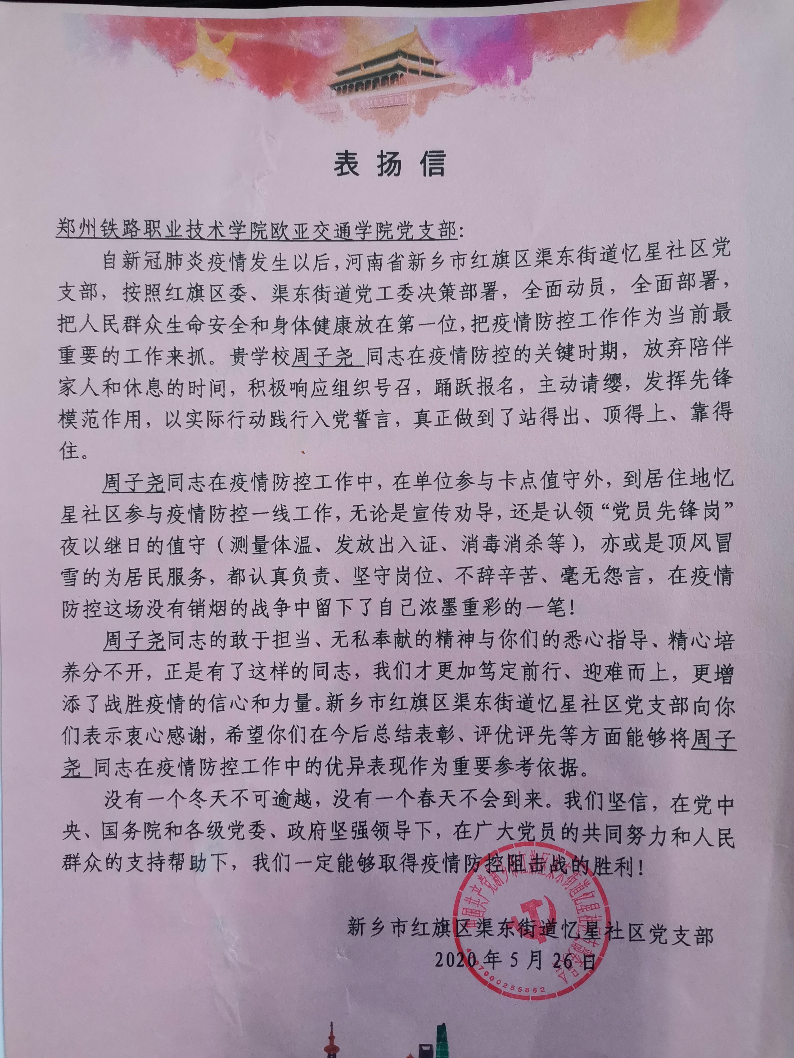 日前,新乡市红旗区渠东街道忆星社区党支部致信欧亚交通学院,对我院周子尧同学为当地疫情防控工作突出表现进行表扬。