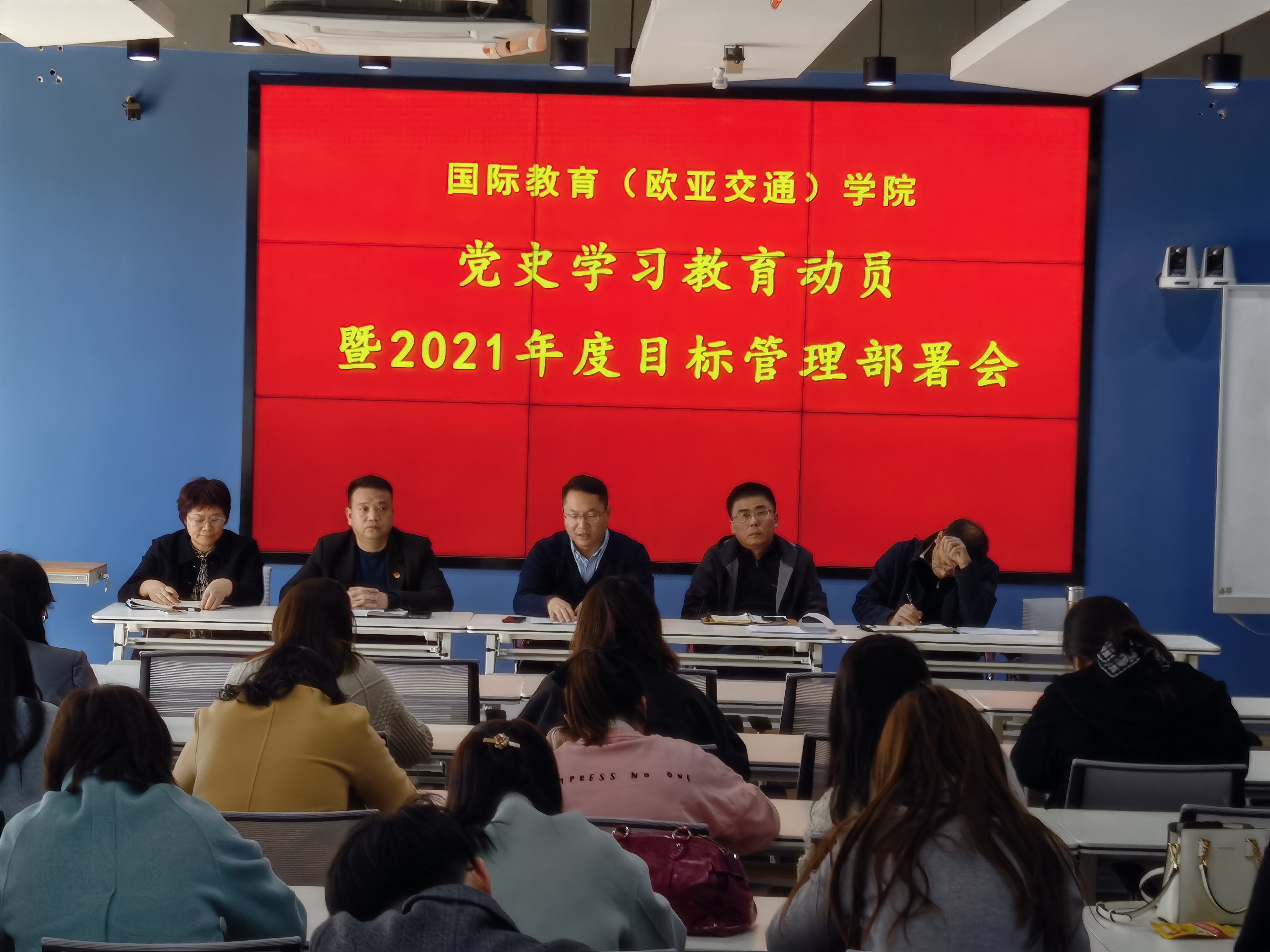 2021年3月24日下午,国际教育学院(欧亚交通学院)党总支在7号楼7215教室召开党史学习教育动员暨2021年度目标管理责任制部署大会,传达学习习近平总书记在党史学习教育动员大会上的重要讲话精神,深入学习2021年度目标管理责任制实施方案。党总支书记曹启勇主持会议。