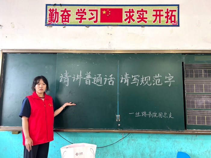 在活动的第一天,“丝小路”推普实践团队员们热情迎接来校的同学们,开始推广普通话的宣传工作。队员们通过清晰地书写“请写普通话,请写规范字”等标语,引导同学们了解普通话的重要性,并引导他们正确的发音和书写规范字。