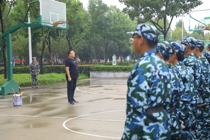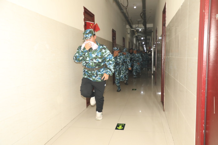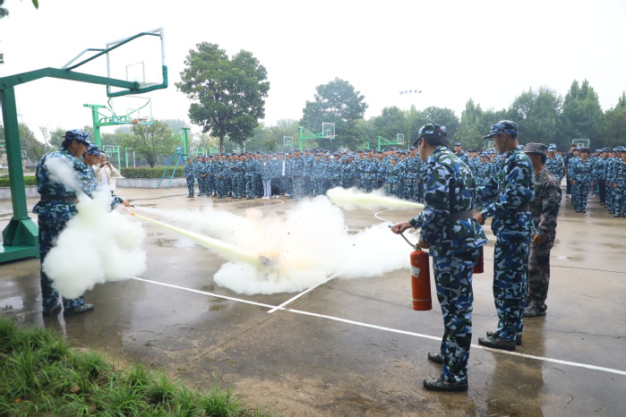 听到哨声,学生弯着腰捂好口鼻,根据逃生标识的引导,迅速有序地从宿舍转移到安全地点。随后由军训教官讲解灭火器的分类知识,现场进行灭火器使用的演示,整个演练过程安全有序。