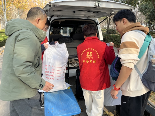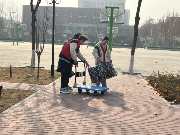 12月9日,学生会志愿者早早的守候在宿舍楼前接过同学手中的行李,把行李搬上车。小红衣大温情,丝路书院的志愿者们在校园中来回穿梭用推车帮助离校的实习生运送行李,成为了校园中最靓丽的一道风景线。
