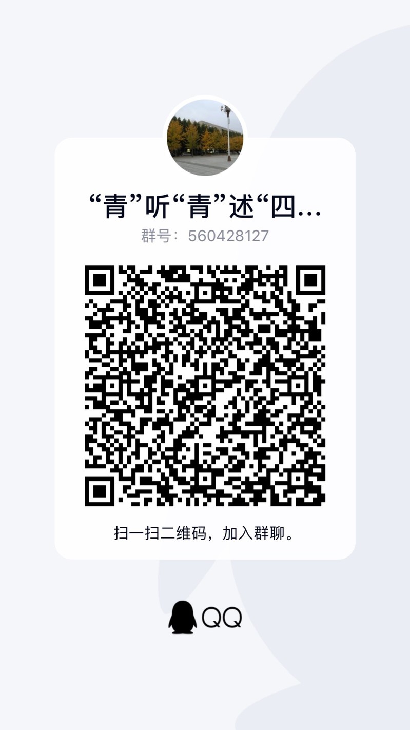 各年级思政课教师通知网络初赛事宜,在自己所教班级中遴选出优秀学生代表,组成优秀讲述员或讲述团队。参与同学可按照课堂实践计入平时成绩。请各思政课教师从自己所教的每个班级中遴选出至少1位优秀讲述员或团队,并担任指导老师,参加网络初赛,并组织参赛学生于11月22日17:00前按要求在学习通“青”听“青”述“四史”栏目上传作品(具体操作流程见附件1)。参赛学生可通过搜索群号560428127或扫描下方二维码加入QQ群,以便及时接收活动各项通知。
