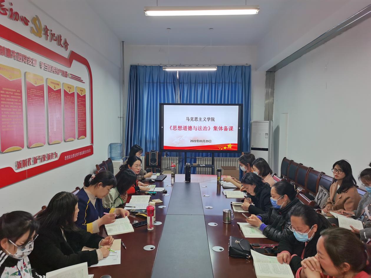 为了凝集教师合力,营造良好的教学研究氛围,增强教师合作意识和凝聚力,保证教学进度的统一,马克思主义学院《思想道德与法治》课教研室于3月29日下午组织开展了集体备课会。