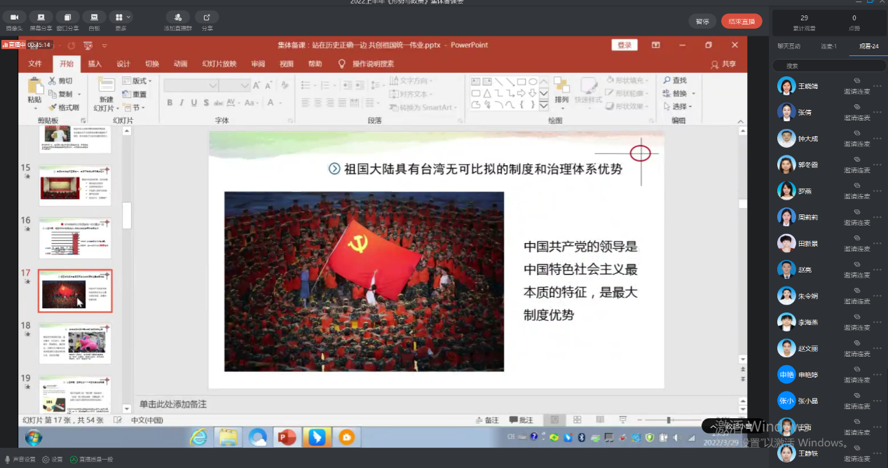 为了进一步规范教学过程和环节,统一教学内容和要求,提高课堂教学质量,2022年3月29日,形势与政策课程的全体专兼职教师进行了线上备课。