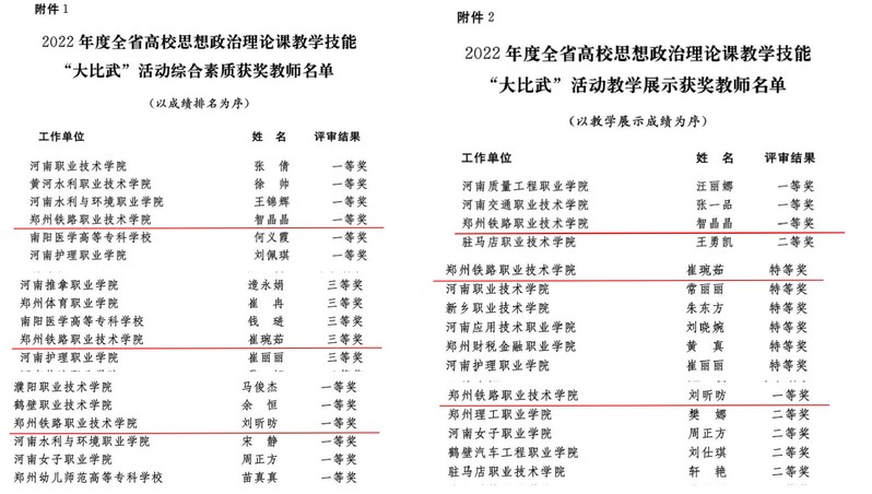 日前,中共河南省委宣传部、中共河南省委教育工作委员会、河南省教育厅发布了《关于公布2022年度全省高校思想政治理论课教学技能“大比武”活动评选结果的通知》(豫教工委〔2022〕84号),对评选结果进行公布。按照“大比武”活动方案,共评出综合素质特等奖54项、一等奖150项、二等奖156项、三等奖159项;教学展示特等奖83项、一等奖173项、二等奖263项;优秀组织奖7个。全省共有130多所本专科学校的519名教师参赛。我校马克思主义学院推选崔琬茹、智晶晶、刘昕昉3名教师参加了全省高校思想政治理论课教学技能“大比武”比赛。