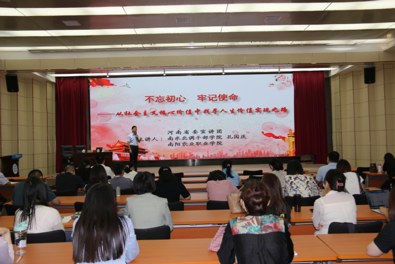 此次讲座特邀南阳农业职业学院校长孔国庆教授作现场宣讲,学校党委副书记、工会主席徐宏平主持会议。讲座采取线上线下相结合的方式召开,马克思主义学院专兼职思政课教师和其它教学院部的代表参加。