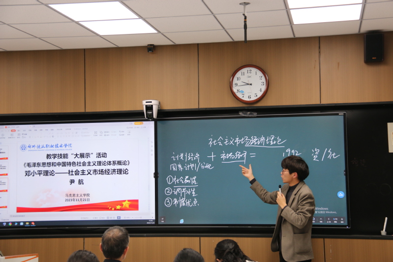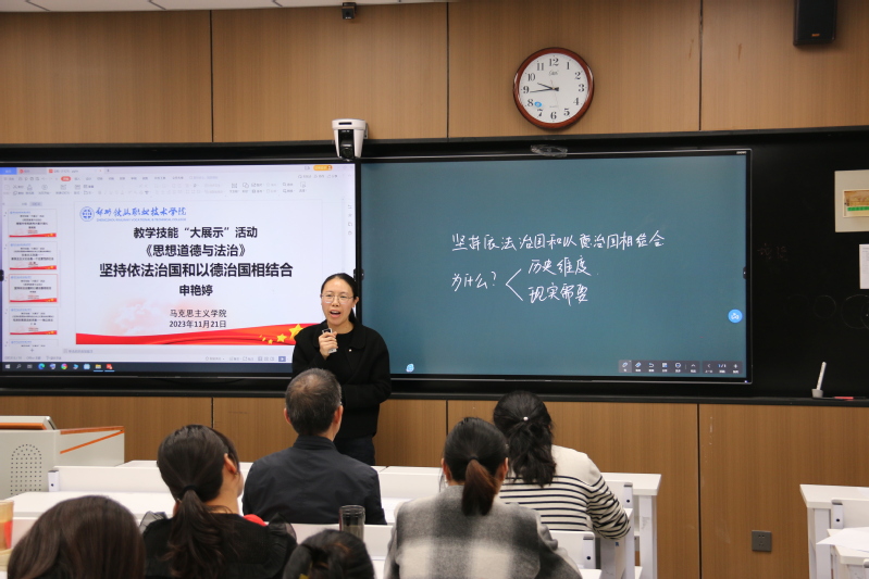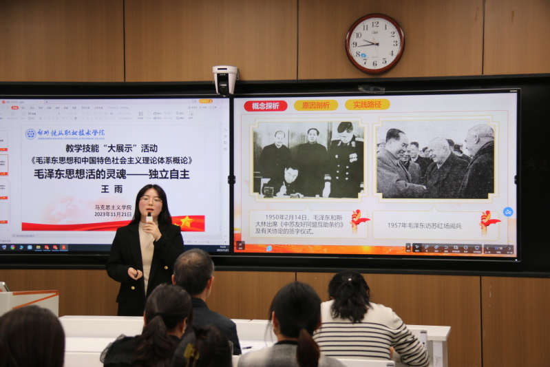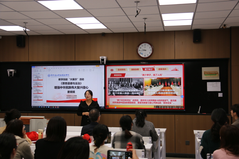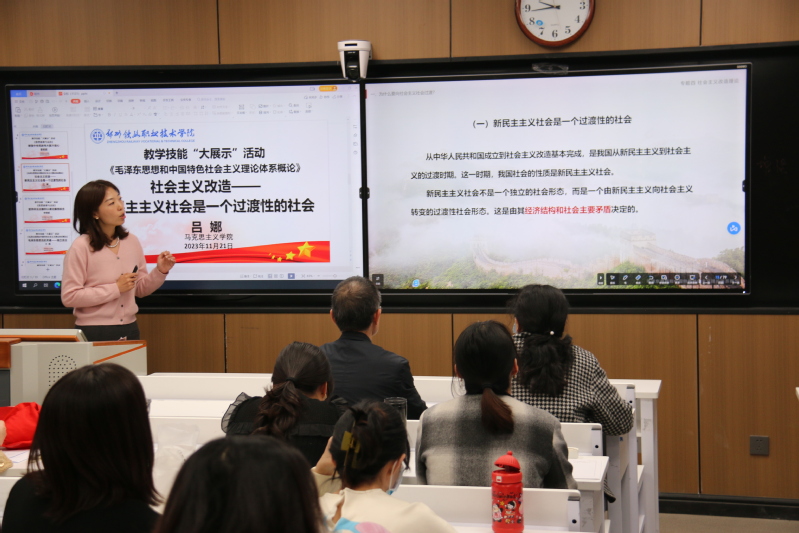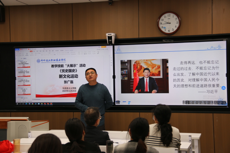 本次展示活动由晏娟娟老师打头阵,晏老师展示的题目为《增强中华民族伟大复兴信心》。在展示环节,晏老师运用丰富的授课案例,将学习通等多媒体技术融会贯通,引发了老师们的热烈掌声。接着吕娜老师进行展示,吕老师展示的题目为《新民主主义社会是一个过渡性的社会》。在展示中吕老师授课仪态自然、娓娓道来,展示了其丰富的授课经验和较高的理论水平。第三个展示的是申艳婷老师,申老师展示的题目为《坚持依法治国与以德治国相结合》。在授课中,申老师引经据典,运用了大量的史书典籍来论证教学观点,展现了其丰厚的学识和过人的专业知识。第四个展示的是王雨老师,王老师展示的题目为《毛泽东思想活的灵魂——独立自主》,王老师将毛泽东诗词融入课堂讲授,具有较强的吸引力和创新性。接着,尹航老师进行展示,他展示的题目为《邓小平理论——社会主义市场经济理论》,尹老师的授课将经济学的专业知识巧妙融入思政课堂中,逻辑清晰、有层次,有效地论证了其授课观点。第六个进行展示的是张广磊老师,张老师展示题目为《新文化运动》,在展示环节张老师的讲授慷慨激昂、引人入胜,通过案例的对比论证,博得了观摩教师的阵阵喝彩。最后一个展示的是陈鸽老师,陈老师展示的主题为《新民主主义革命的总路线》,陈老师巧妙运用板书,结合学生的学习特点,将总路线的内容讲解得十分清晰、透彻、到位。