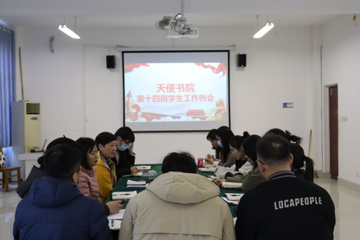 20211130日,天使书院在G楼三楼会议室召开第十四周学生工作例会,党总支书记王芳,副院长王小珂,书院办公室主任马鹏飞,组织员李文煜及全体学工人员参加会议。会议由党总支书记王芳主持。