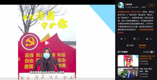 “不要怕!我在许昌守护你!”这是我校天使书院G3-5社区王瑞洁同学在抗疫志愿服务中发出的铿锵誓言,这感人的一幕出现在河南省教育厅官方微博“河南教育”、郑州市委宣传部官方微博“郑州发布”于1月12日相继发布的“河南师生抗疫一线为你守护”的宣传视频《别怕,我在这里守护你!》当中,充分展现出郑州铁院学子抗击疫情的毅然决然和责任担当。