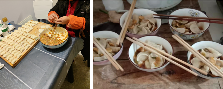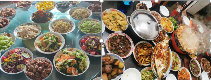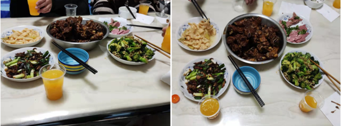 ICU护理21A2班卫欣:“在我们这里年夜饭是在除夕夜的八点左右,大家按照传统习俗吃的大多是饺子,而且第一碗饺子是一定要敬给灶王爷,其次是给长辈。接下来的活动就是放鞭炮,但因政策原因,现在不允许燃放烟花爆竹,所以是取消了这个活动。最后大家就开始准备各种小菜例如凉拌牛肉,蒜藕,凉拌黄瓜等,大人们配上各种酒,小孩子们则是喝着果汁汽水,大家一起热热闹闹的边看春晚边享用年夜饭。”