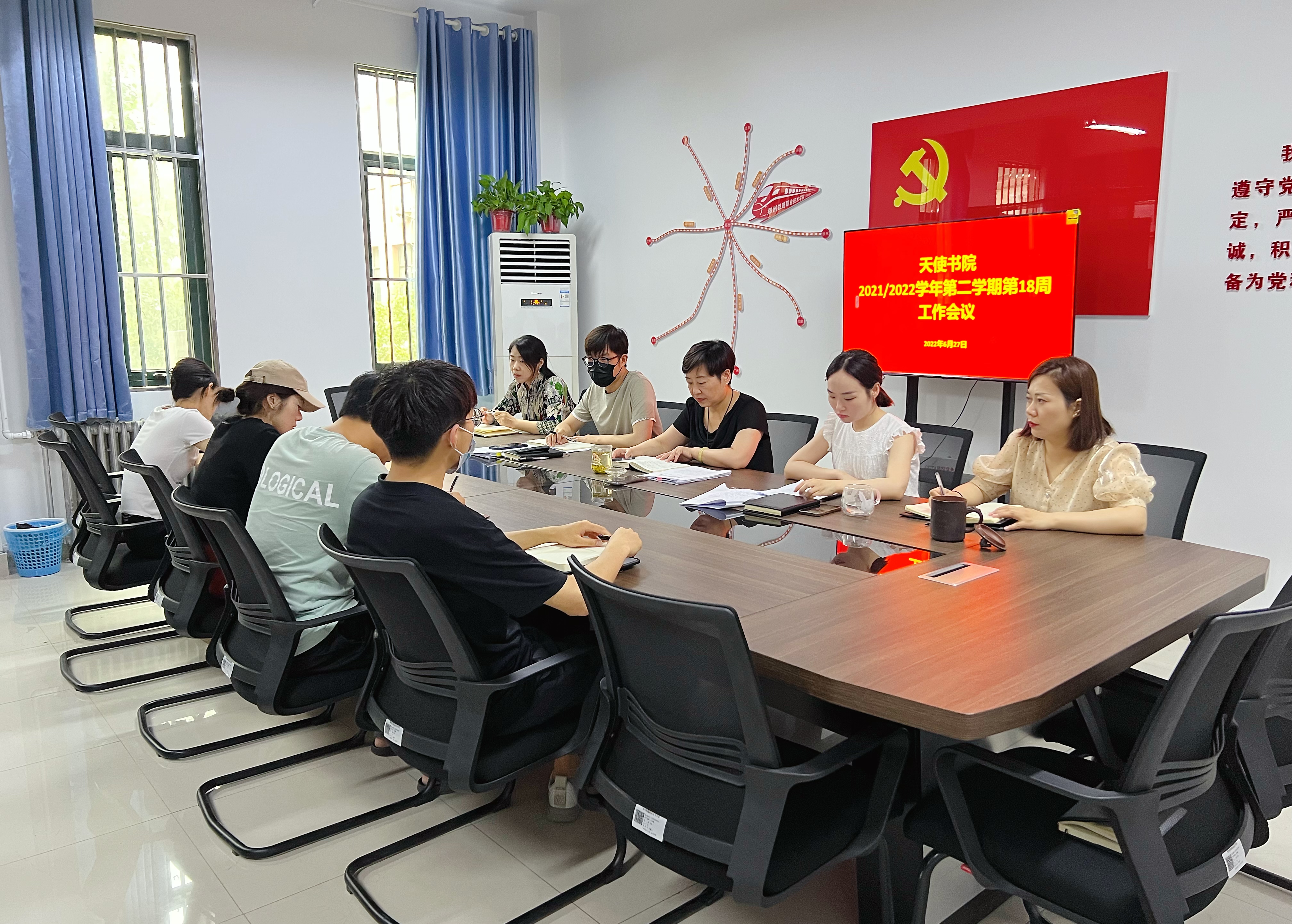 2022年6月27日,天使书院在二楼会议室召开本学期第十八周工作会议,书院党总支书记、院长王芳,党总支副书记、副院长王翡翡,副院长王小珂,书院办公室主任马鹏飞,组织员李文煜及全体专职辅导员参加会议。会议由党总支书记王芳主持。