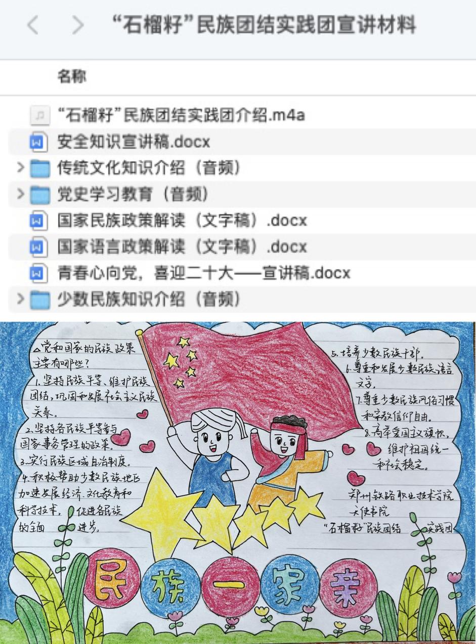 丰富形式,积极筹备。围绕“民族团结”主题立意,团队成员集思广益,创新形式,充分发挥个人特长完成整理国家民族政策、语言政策、党史学习教育、中华优秀传统文化知识、少数民族知识、日常安全知识等文字或音频宣讲材料,设计制作创意海报,创作多幅书画作品,为下阶段开展理论宣讲、宣传展览、推广和深化活动社会效应奠定良好基础。