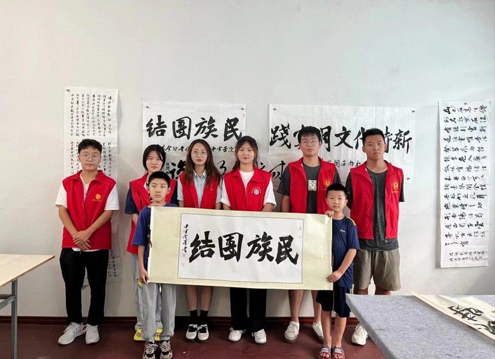 进行文化交流学习,彰显中华优秀传统文化魅力。团队成员积极参与并协助开展河南省济源市五龙口镇“快乐成长”暑期志愿服务项目,充分发挥个人兴趣特长,多次深入乡村地区举办民族团结主题书法课堂教学活动,同时将书法艺术与日常生活相结合,利用书签、折扇、纸杯等实物制作创意书法工艺品,弘扬书法艺术,展现传统文化魅力;参加少数民族文化展览活动,学习少数民族优秀文化和风俗习惯,增强对我国少数民族文化的研究兴趣,提升民族文化意识;调研少数民族聚居区普通话普及和使用情况,通过微信、微博等新媒体形式宣传国家语言政策和普通话知识。