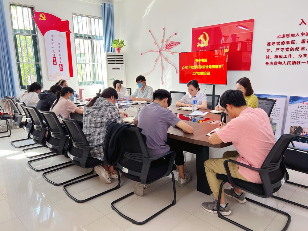 2022年9月7日下午,天使书院在书院二楼会议室召开2022年秋季开学安全隐患排查工作部署会议,党总支副书记、副院长王翡翡,副院长王小珂,书院办公室主任马鹏飞,组织员李文煜及全体专职辅导员参加会议。会议由副院长王小珂主持。