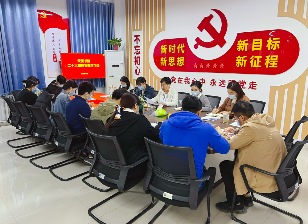 2022年10月18日晚,天使书院党总支在书院二楼会议室召开党的二十大精神专题学习会,书院领导班子全体成员及全体专职辅导员参加会议。会议由党总支书记、院长王芳主持。