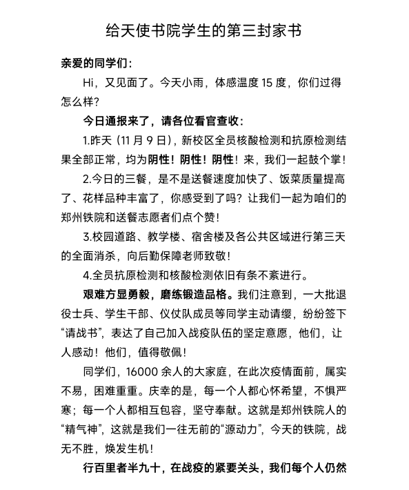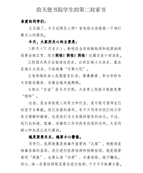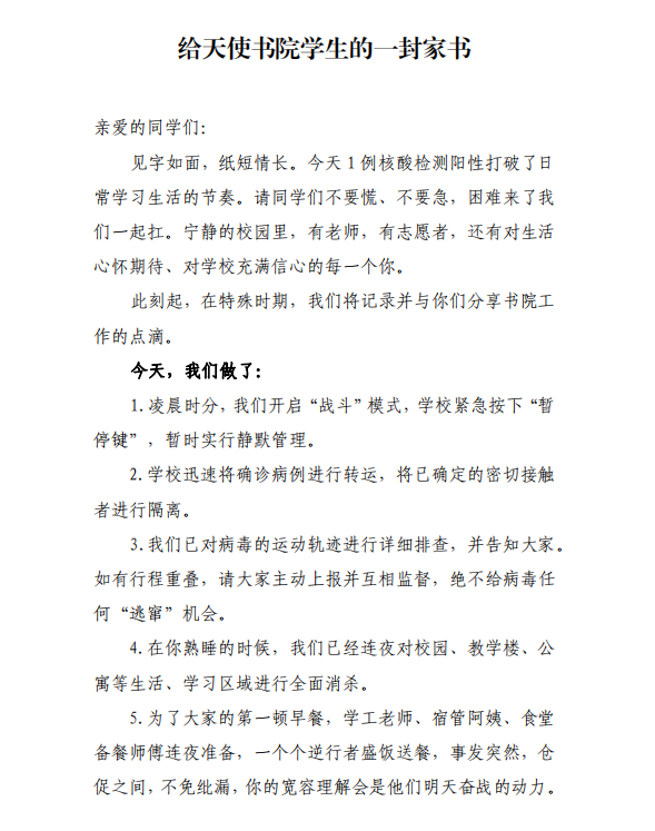 烈火见真金,疫情显党性。当前,学校疫情形势严峻复杂,但任何艰难险阻都吓不倒、压不垮天使书院全体师生。我们坚信,在学校党委的正确指引下,天使书院党总支的坚强领导下,书院全体师生将以高度的政治责任感和使命感,发扬传承伟大的抗疫精神,把疫情当教材,在抗击疫情中“石以砥焉,化钝为利”,磨练意志、快速成长,坚决筑牢校园疫情防控安全堤坝,坚决打赢校园疫情阻击战阶段性胜利!